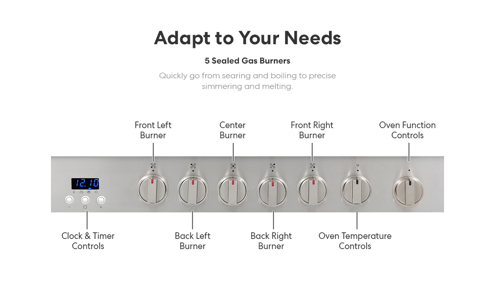 5 SEALED BURNERS: High-performance gas burners which allow you to cook from a high heat for boiling, frying, or searing to a low simmer for delicate sauces. Includes a 17,400 BTU Burner, 8,200 BTU Burner, two (x2) 6,900 BTU Burners, and 5,000 BTU Burner