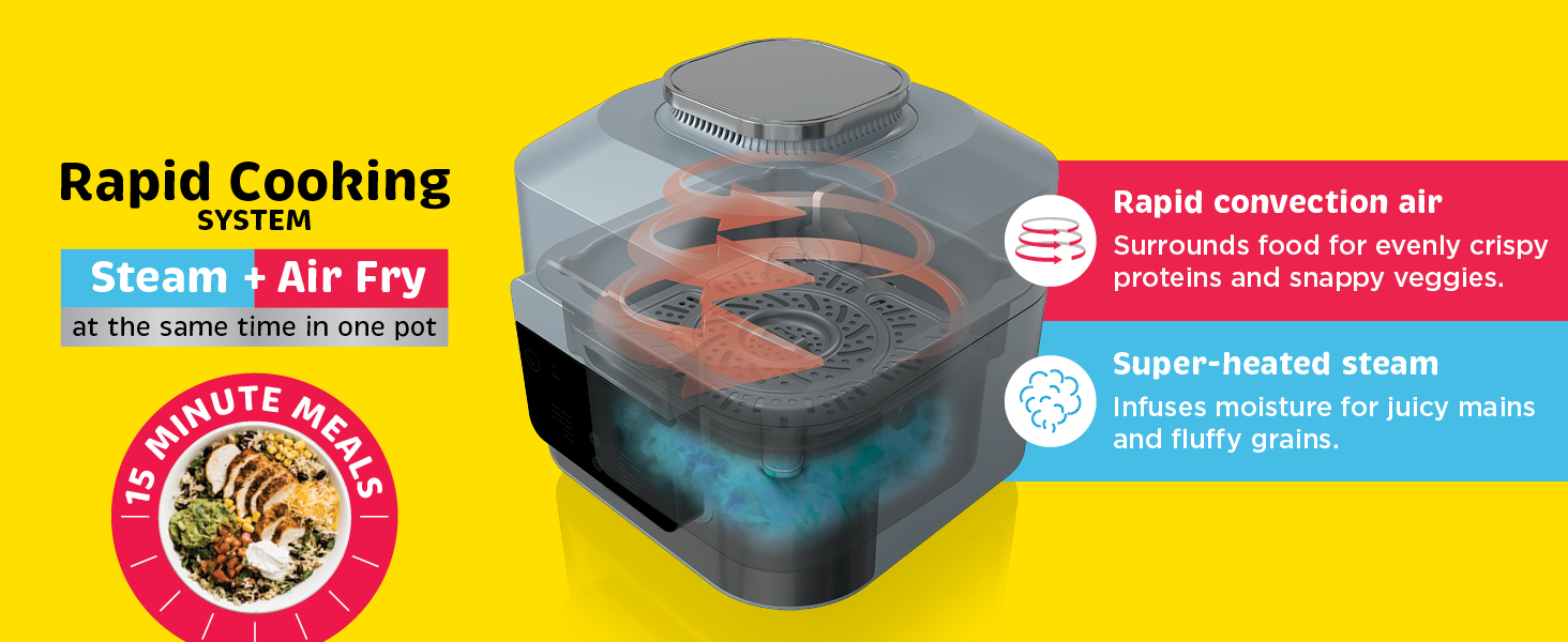 - RAPID COOKING SYSTEM: Quickly create moisture with steam while caramelizing and crisping with air fry technology at the same time in one pot when in Rapid Cooker mode to get restaurant-worthy results.